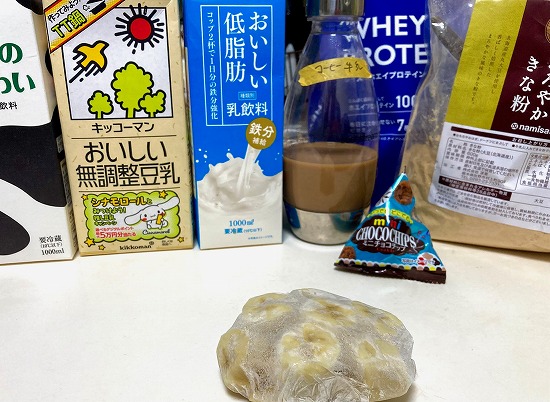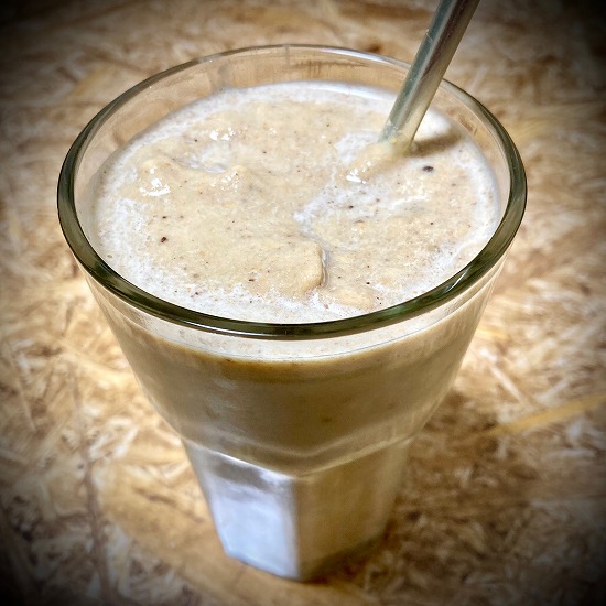 冷凍バナナに、ありとあらゆる合いそうなものをブチこんでミックスさせたバナナスムージー。