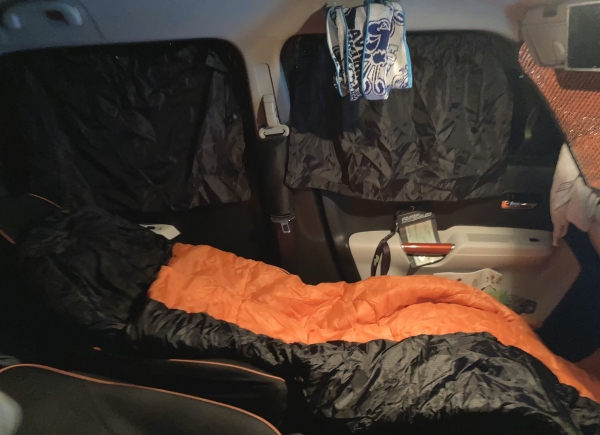 気持ち程度の車窓カーテン。そしてシュラフ。